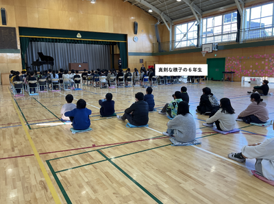 数日前の6年生を送る会のにぎやかなムードとは打って変わって,真剣な眼差しと厳かな雰囲気の6年生の後ろ姿をしっかりと見学しました。