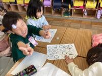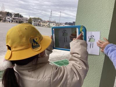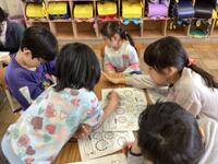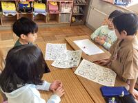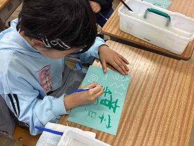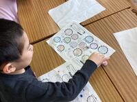 紙に穴をあけて,亀やスカート,アイスクリームなどを描き,いろいろな模様を探しに行きました。