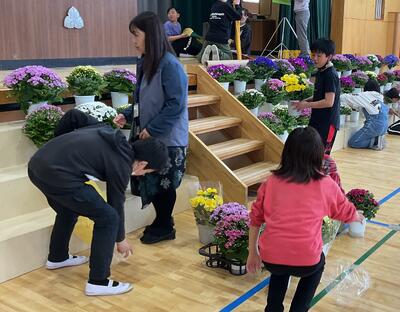 1年生が描いたお花の絵などをバランスよく配置するために声をかけあう様子が見られました。