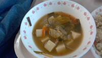 献立(こんだて)は、わかめごはん、豆腐と鶉の卵のチリソースに(とうふとうずらのたまごのちりそーすに)、チョレギサラダ、りんごゼリー、牛乳(ぎゅうにゅう)でした。わかめごはんは、いつものご飯(ごはん)よりもしょっぱくておいしかったです!