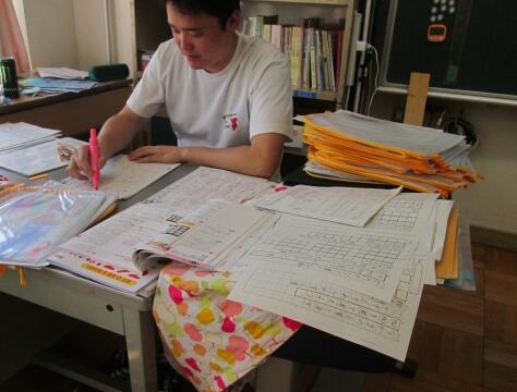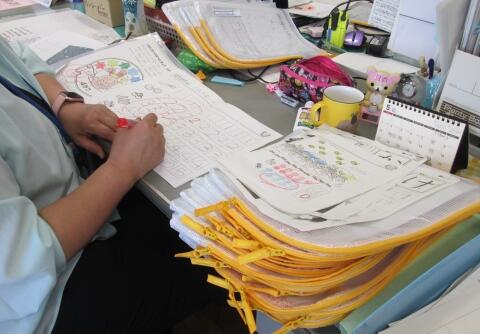 提出された課題は,担任が丸付けをしたり,教室に掲示したりしています。