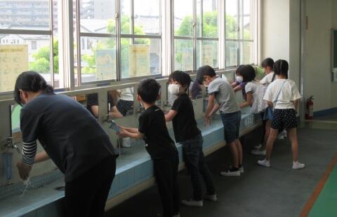 感染予防のため,児童会役員が各教室を回って募金を集めています。