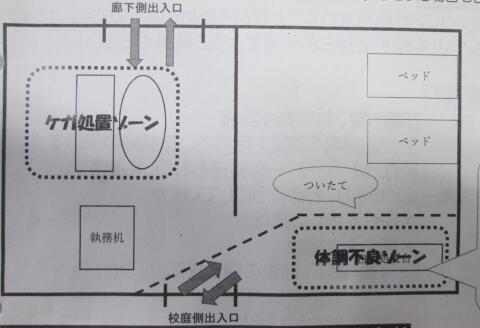 ・保健室での感染を防ぐために,体調不良者ゾーンとケガの応急処置ゾーンの区分けをするようなレイアウトにしました。
