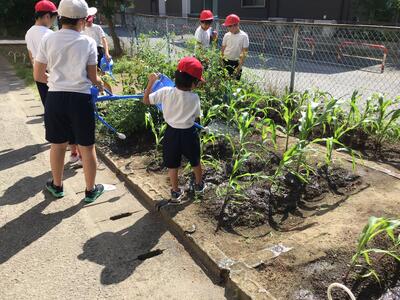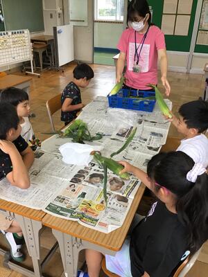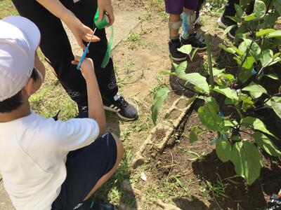 旭小学校に素敵なグリーンカーテンができるように気持ちを込めて作業していました。