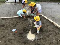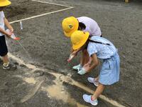 校庭の一角に流水実験スペースを作り,川を再現して,流れる水のはたらきについて考察しました。