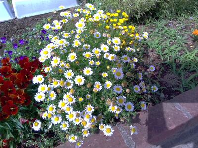 旭小学校の花壇には花が咲いています。季節によってちがう花が咲いていて、色とりどりできれいな花を見ることができます。左の赤い花がパンジー、右の白い花がフランス菊となっています。
