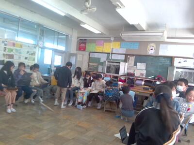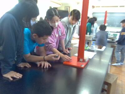 今の5年生の理科はふりこの実験をしています。ふりこはどんなことをすれば10往復する時間が変わるのか、調べてノートにまとめています。実験が終わったら班で自由にふりこを使って遊びました。