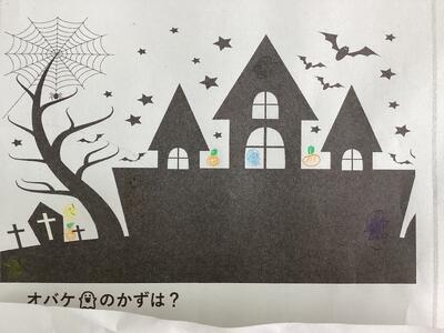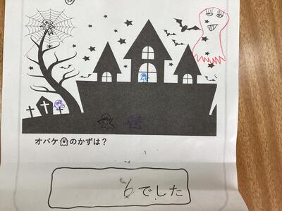 ワークシートに思い思いのおばけを書いて,何体いるかの問題を出し合いました。