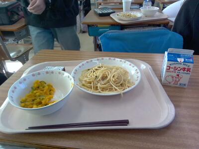 今日の給食は、和風スパゲッティ、かぼちゃのサラダ、チョコケーキ、牛乳でした。今日の給食はみんな大好きなスパゲッティとチョコケーキだったのでみんな喜んで食べていました。「パル谷」