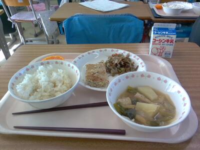 今日の給食は、ご飯、やきさんが、ごもくきんぴら、味噌汁、ポンカン、ぎゅうにゅうでした。今日はあまり出ない、やきさんがでとてもおいしかったです。「パル谷」