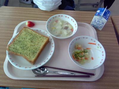 今日の給食は、ガーリックパン、はちみつドレッシングサラダ、カブのクリームスープ、いちご、ぎゅうにゅうでした。今日の給食は特にいちごが人気でじゃんけん大会になっていました。「パル谷」