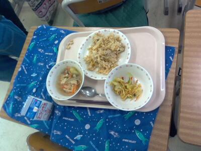 今日の給食は、キムチチャーハン、おさつサラダ、五目スープ、豆、牛乳でした。「おさつさらだってなんかお金持ちになった気分になりますよね」「パル谷」