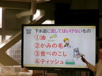 今回の授業のねらいは,「下水の仕組みや役割について理解を深め,生活環境や自然環境を守るために協力できることを考えるきっかけをつくる」です。講師は管路管理総合研究所の2名の方と柏市下水道工務課の2名の方です。①よごれた水はどこに行くの?→②なぜ下水道があるの?→③よごれた水はどうなるの?→④マンホールにはどんな絵が描かれているの?→⑤トイレットペーパーとティシュを水に入れてかき混ぜるとどうなる?(実験)→⑥下水道に流してはいけないもの・・・という内容で学習しました。トイレットペーパーとティッシュの実験では,実験終了後に子ども達から「水に流せるティッシュは,流れるのですか?」という質問がでました。とてもよい疑問でした。実際に実験してみると・・・なかなかなかなか・・・とけません。ずーっとかき混ぜていると,やっと溶け始めてきたという状況に,驚いていました。こんなに溶けずらいのかと私も驚きました。