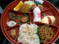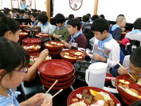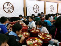 お昼は、大きな器の大名弁当を食べて、みんな大満足でした。ほとんどの児童が残さず食べました。みんなで食べるとおいしいね。