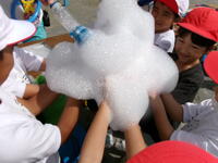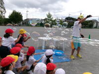 子ども達のワクワクに満ち溢れた目,飛び跳ねて喜ぶ様子,友達と協力する姿,キラキラ光るシャボン玉・・・とてもすてきな学びをすることが出来ました。石井先生,ありがとうございました。(校長 小田川)
