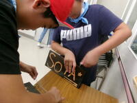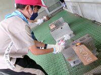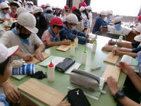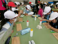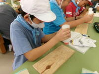 1日目の創作活動では,「焼き杉」の体験を行いました。事前にデザインを考えてあったので,作業はスムーズに行うことが出来ました。ガスバーナーを使って焼いたのですが,初めてのガスバーナーも施設の方の使い方の説明をよく聞いて,上手に扱うことが出来ていました。とても素敵な世界に一枚だけのプレートが出来上がりました。