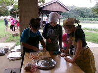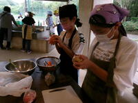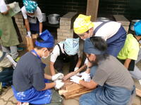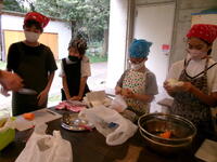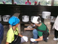 創作活動の後は,飯盒炊飯で夕食のカレー作りをしました。食材を切る調理グループと火起こしグループに分かれて行いました。特に火の当番は,初めての火起こしでしたが,薪を調整して入れたり,薪が足りなくなると薪割をしたりなど,普段できない体験をしながら頑張っていました。仕上がったカレーは,とても美味しかったです!