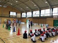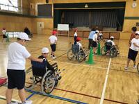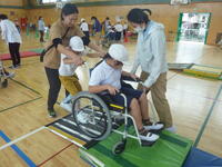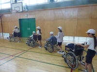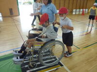 4年生は各クラスごとに,体育館で車いすの体験をしました。ほとんどの人が,乗るのも押すのも初体験!