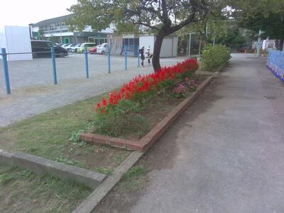 旭小学校の花壇には花が咲いています。季節によってちがう花が咲いていて、色とりどりできれいな花を見ることができます。左の赤い花がパンジー、右の白い花がフランス菊となっています。