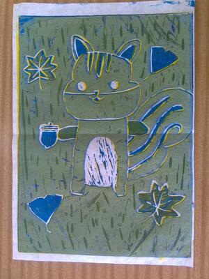 ちょうこく刀でいろいろな形を掘ったあとに、刷るというのを3回繰り返しました。(あお)