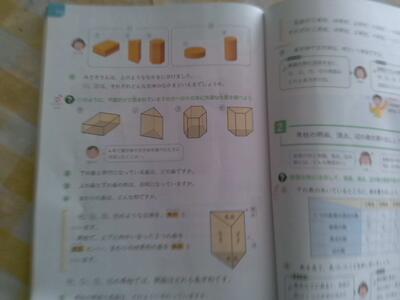 5年生では今算数で、角柱と円柱を調べています。最初は仲間分けをして、角柱と円柱を分けます。角柱を調べて特徴も調べます。下の写真は教科書の写真です(T,,M)