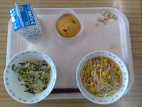 今日の給食は、味噌ラーメン、大根サラダ、キャロットケーキ、いりだいずでした。味噌ラーメンはとても美味しかったです。 (とうゆだくとR)