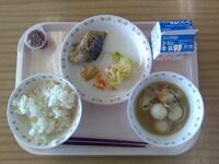今日の給食は、ごはん、だまこじる、さばのみそに、ぽんずあえ、一口ぶどうゼリーでした。サバの味噌煮は味噌がよくとても美味しかったです。 (とうゆだくとR)