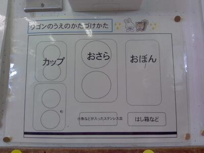 これは、給食のワゴンの片付け方です。お皿の位置が書いてあります。ワゴンチェックというワゴンの上をきれいに片付けるということをやっている委員会がいます。