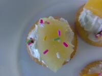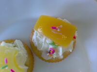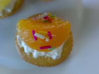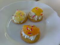 7月17日木曜日、なかすこ学級(がっきゅう)でカナッペ作りをしました。クッキーの上にのせた具(ぐ)はみかん・パイン・黄桃(おうとう)の三種類(さんしゅるい)でした。カラーチョコレートもかけたのでとても甘(あま)くておいしかったです♪(UFO)