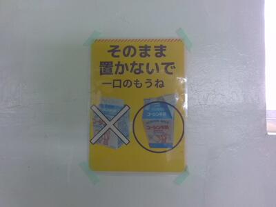 これは、そのまま置かないで(おかないで)一口(ひとくち)のもうねと書いてある(かいてある)ポスターです。