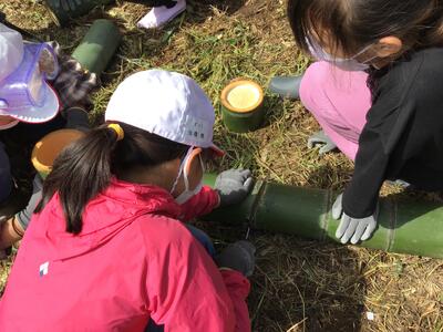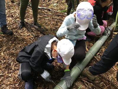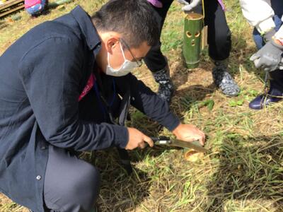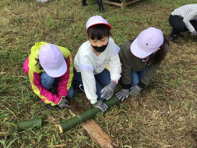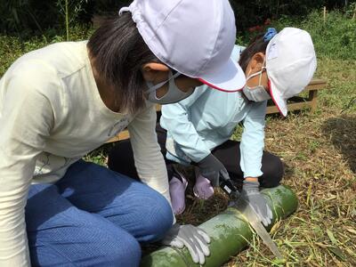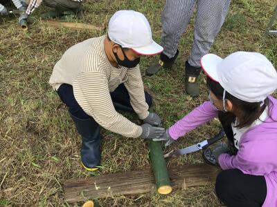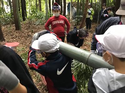 のこぎりを使って,チームで協力して太くて大きい竹を切り出すことができました。