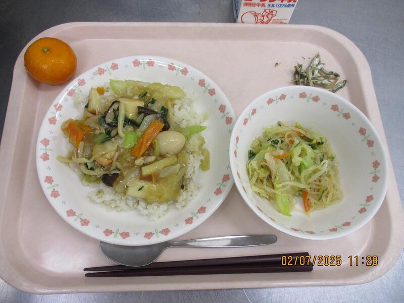 一覧へ 今日の給食 日時 2025年07月02日(水) 公開対象 給食メニュー 詳細 うずら卵入り豆腐の中華丼 バンサンスウ 冷凍みかん こざかな 牛乳 作成者 旭小学校 更新日時 2025-07-15 13:08:38