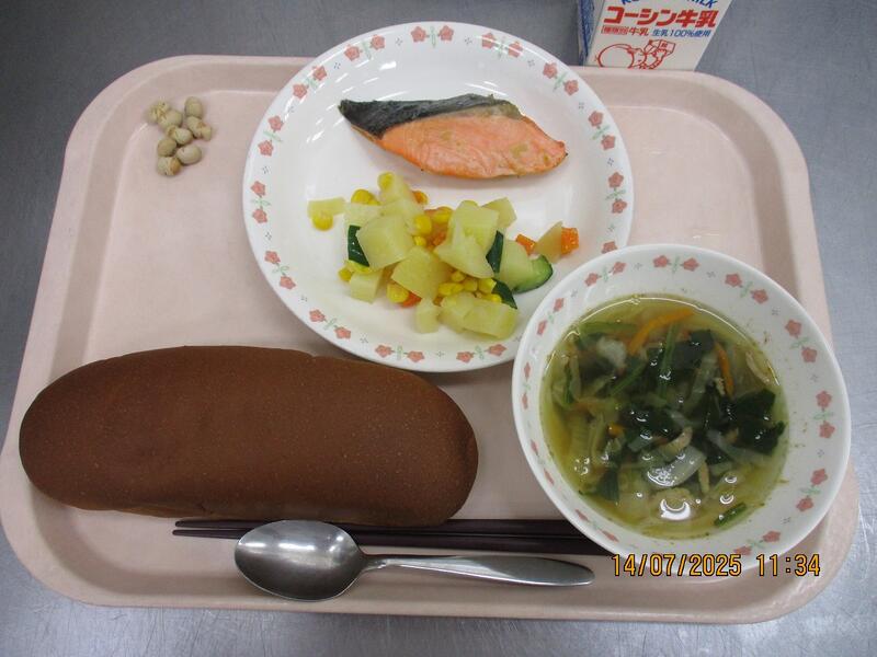 一覧へ 今日の給食 日時 2025年07月14日(月) 公開対象 給食メニュー 詳細 黒糖パン 鮭のレモンソースがけ マセドアンサラダ 千切り野菜スープ いり大豆 牛乳 作成者 旭小学校 更新日時 2025-07-15 13:29:11