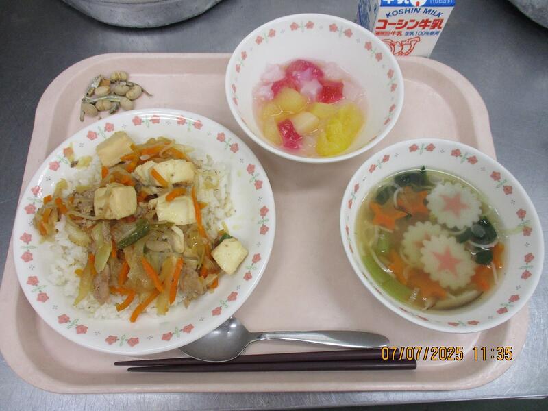 一覧へ 今日の給食 日時 2025年07月07日(月) 公開対象 給食メニュー 詳細 すき焼き丼 七夕そうめん汁 七夕ゼリーポンチ 大豆小魚 牛乳 作成者 旭小学校 更新日時 2025-07-15 13:11:29