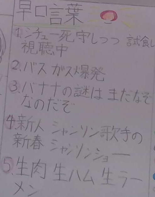 今回(こんかい)の新聞(しんぶん)には、早口言葉(はやくちことば)が載(の)っていました。写真(しゃしん)にある、1番(いちばん)と4番(よんばん)が難(むずか)しいです(・。・;皆(みな)さんは、言(い)えますか??ぜひ、友達(ともだち)や家族(かぞく)、先生(せんせい)と挑戦(ちょうせん)してみてください【らむね】