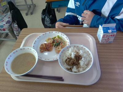 今日の給食は、ふりかけご飯、ごま仕立て味噌汁、鶏肉のマーマレード焼き、おひたし、牛乳でした。マーマレード焼きはタレと鶏肉がマッチしていて美味しかったです。「パル谷」