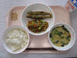 牛乳、ごはん、ししゃものいそべ揚げ、カレー金平、かきたま汁、アーモンド