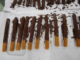 湯せんにかけて溶かしたチョコレートを、チュロスにかけて乾いたら完成です。