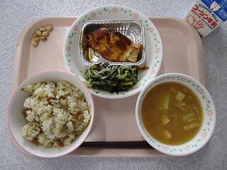 牛乳、鶏ごぼうご飯、鱒の粒マスタード焼き、のり和え、じゃがいものみそ汁、いり大豆