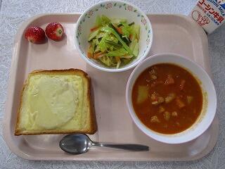 牛乳、ナン、ドライカレー、チーズスープ、いちごゼリー