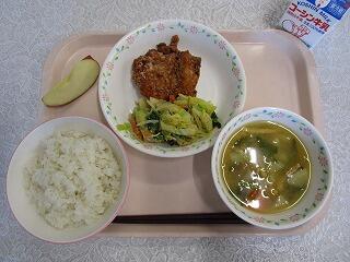 牛乳、ごはん、鶏肉のから揚げ、ごま和え、かぶのみそ汁、りんご