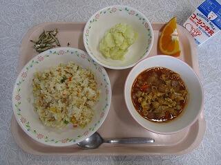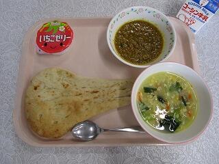 ナンの発祥は,紀元前4000年前のメソポタミア地方と言われていますが,現在は主に北インドで食べられているようです。ナンはちぎってカレーをつけたり、カレーをのせて食べましょう。今日のカレーにはぶた肉・玉ねぎ・にんにく・しょうが・ピクルス・パセリ・大豆・チーズなどが入っています。