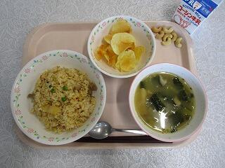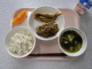 牛乳、ごはん、ししゃものカレー揚げ、じゃがいものきんぴら煮、豆腐とわかめのみそ汁、きよみオレンジ