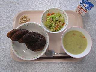 今日は洋食の献立です。根強い人気のココアあげパンは、給食室でサッと揚げてからココアと砂糖をまぶして作りました。ポタージュにはレンズ豆という、レンズのような丸くて平たい豆がつかわれています。今日のポタージュは豆の形が残らないようにしっかりなめらかになるように煮込みました。
