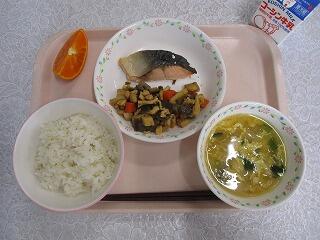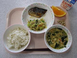 牛乳、ごはん、鯖のソース煮、ごま和え、にらたま汁、ネーブル、いり大豆