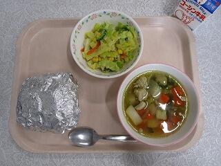 牛乳、ハムとチーズのホットバーガー、ポトフ、コーンサラダ