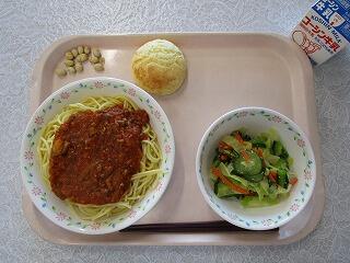 牛乳、スパゲティトマトソース、ハニーマスタードサラダ、もちもちパン、いり大豆