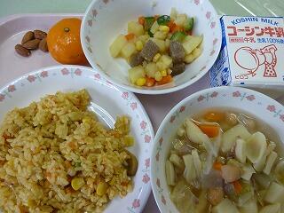 カレーピラフ マカロニスープ 冷凍みかん いりアーモンド 牛乳