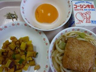 力うどん さつま芋と大豆の揚げ煮 黄桃缶 子魚 牛乳