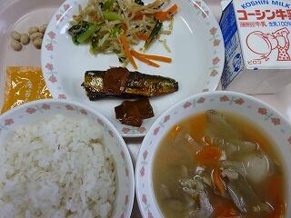 ごはん 鯖の味噌煮 野菜の磯香あえ 田舎汁 晩柑 小魚と大豆 牛乳